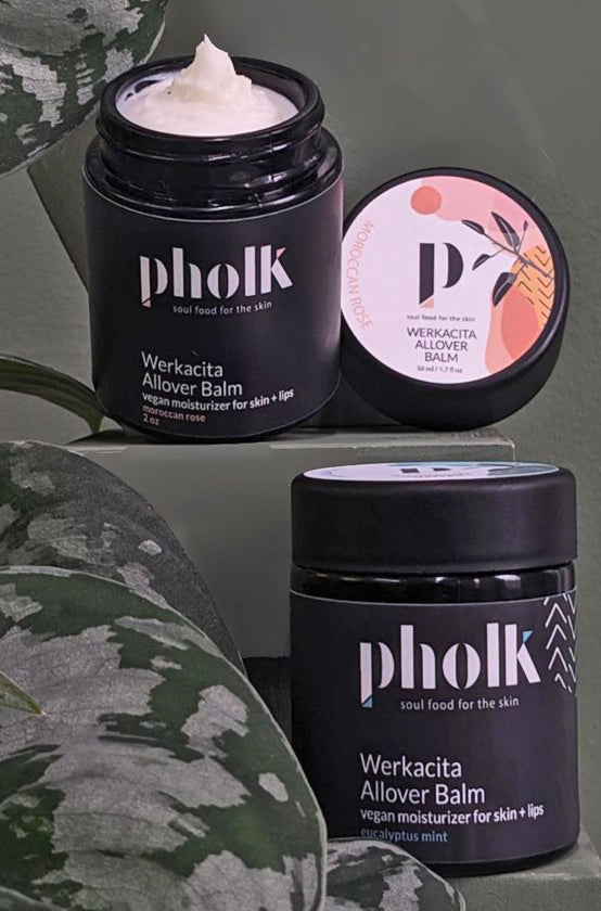 The Werkacita Allover Balm is a vegan multi-tasking moisturizer for anywhere you're ashy. Use it from head to heel for long lasting comfort without clogging pores. Made with all edible ingredients so you can also safely use on lips. Rich in Vitamin E, A and antioxidants this mango and hemp seed oil blend is triple whipped for a velvety texture that absorbs easily into skin. Boosts healing processes from minor irritations, rashes, pollutants and sun.